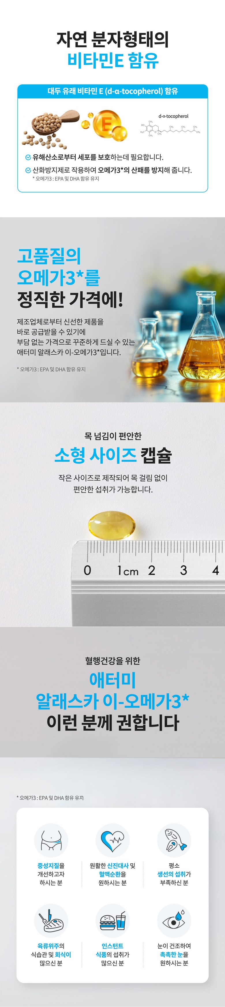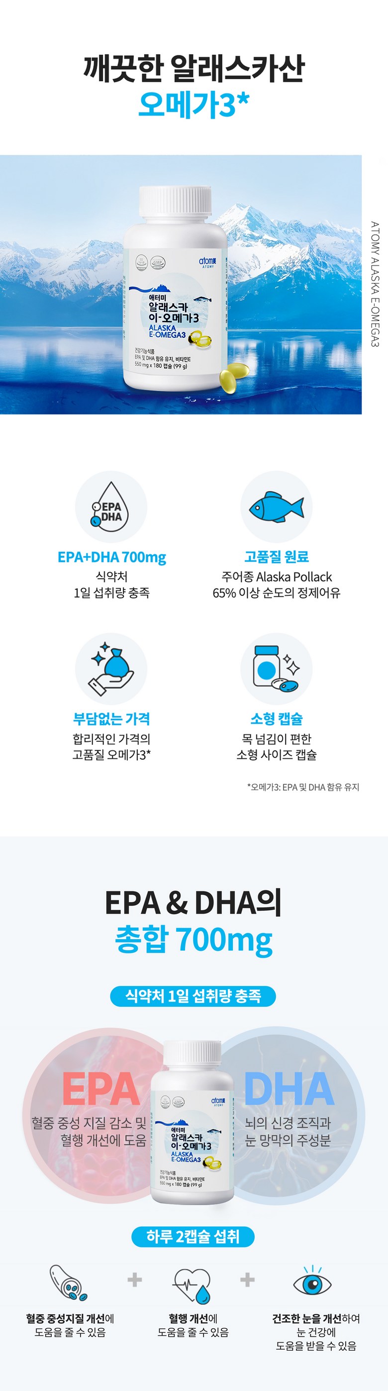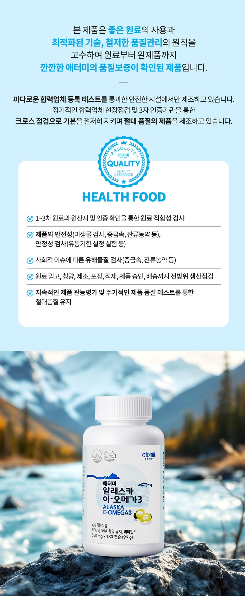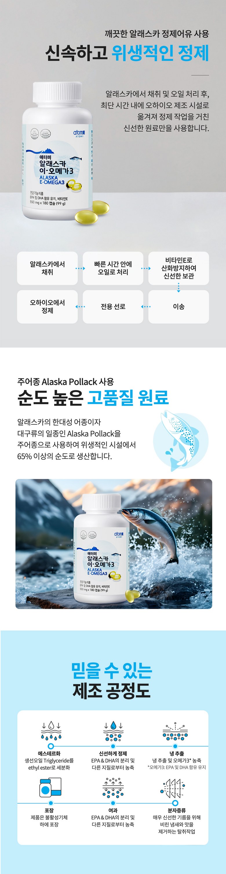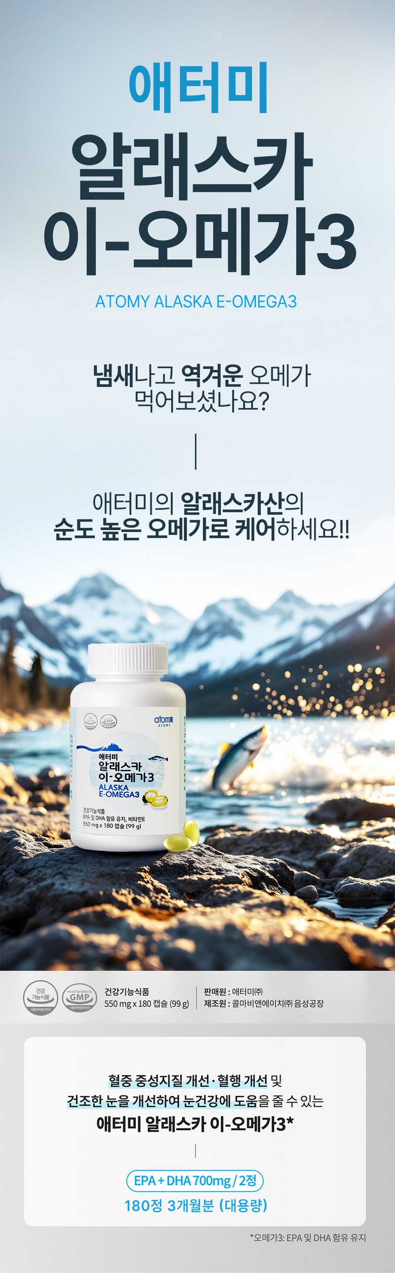 | 제품명 | 애터미 알래스카 이-오메가3* | 제조업소의 명칭과 소재지 | 제조원 : 콜마비앤에이치㈜ 음성공장 충청북도 음성군 대소면 대풍산단1길 8 연구개발 : 콜마비앤에이치㈜ 세종특별자치시 전의면 산단길 22-15 |