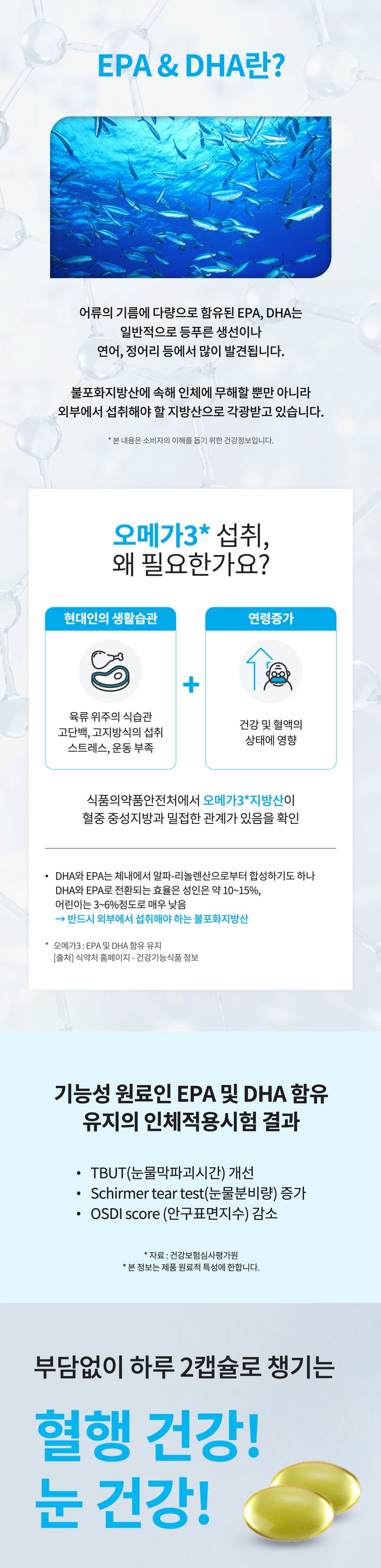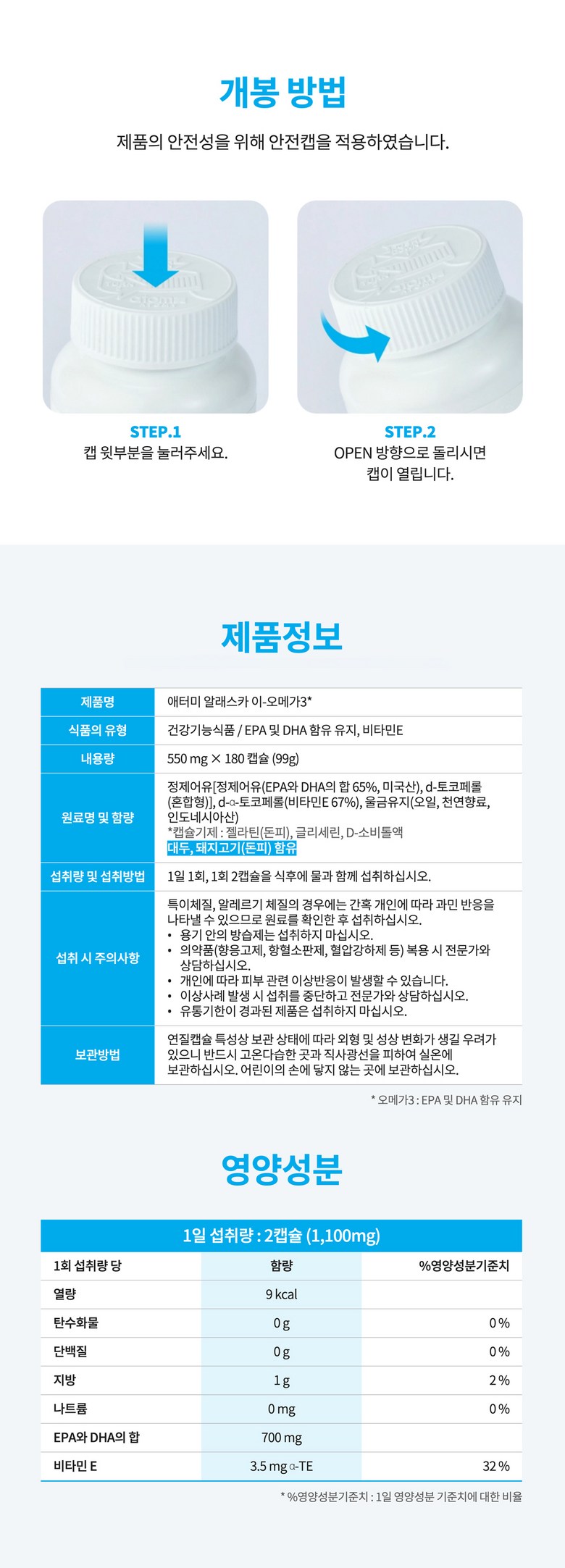 | 원료명 및 함량 | 정제어유[정제어유(EPA와 DHA의 합 65%, 미국산), 토코페롤(혼합형)], d-α-토코페롤(비타민E 67%), 울금유지(오일, 천연향료, 인도네시아산) *캡슐기제 : 젤라틴(돈피), 글리세린, D-소르비톨액 대두, 돼지고기(돈피) 함유 | 영양정보 | 1일 섭취량 : 2캡슐(1,100mg) 1일 섭취량 당 함량 : 열량 9kcal, 탄수화물 0g(0%), 단백질 0g(0%), 지방 0g(0%), 나트륨 0mg(0%), EPA와 DHA의 합 700mg, 비타민E 3.5mg α-TE(32%) ※ ()안의 수치는 1일 영양성분 기준치에 대한 비율임 |