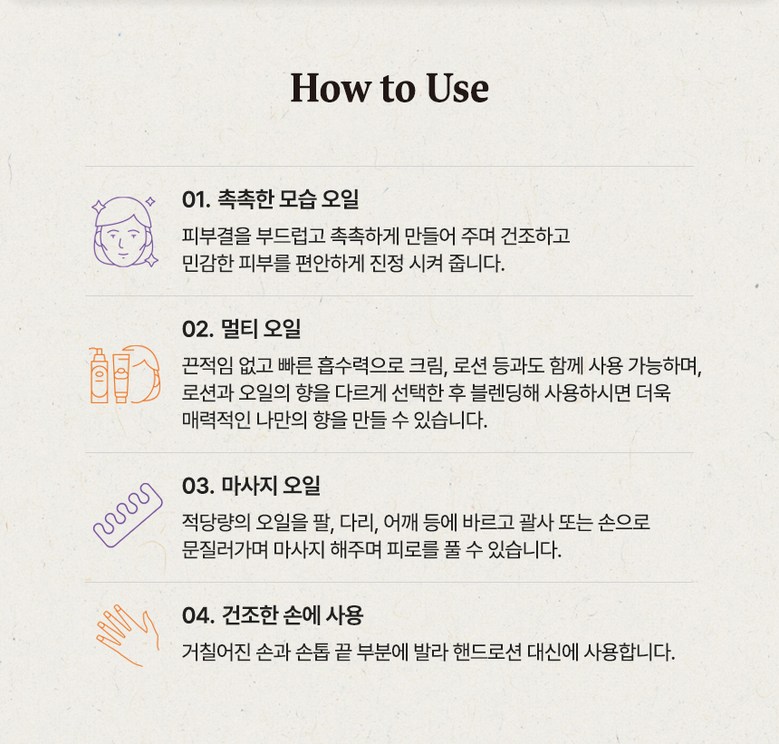 | 사용기한 또는 개봉 후 사용기간 | 사용기한 또는 개봉 후 사용기간:제조일로부터2년 | 사용방법 | 사용방법:적당량의 오일을 팔다리, 어깨, 등에 바르고 괄사 또는 손으로 문질러 가며 마사지해서 흡수 시킵니다. |