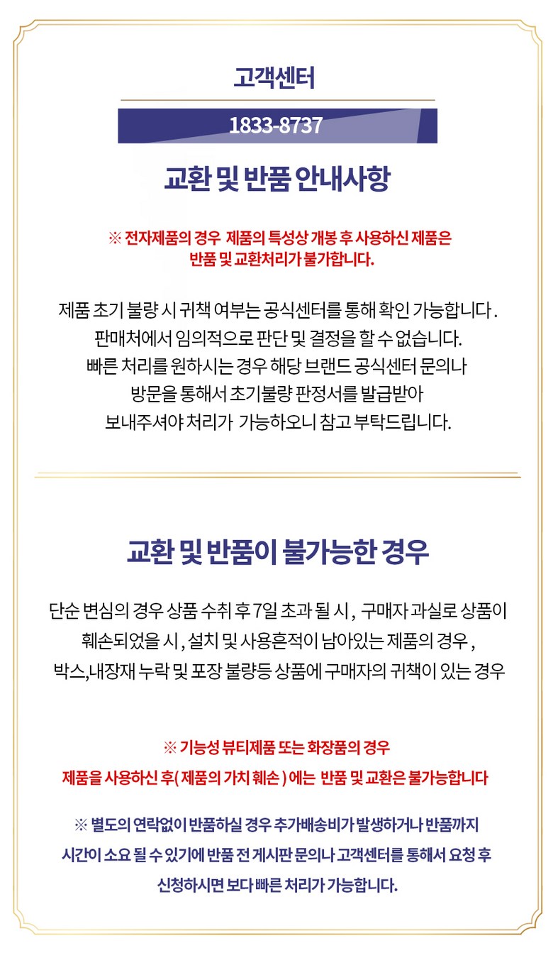 - ㆍ교환/반품에 관한 일반적인 사항은 판매자가 제시사항보다 관계법령이 우선합니다.