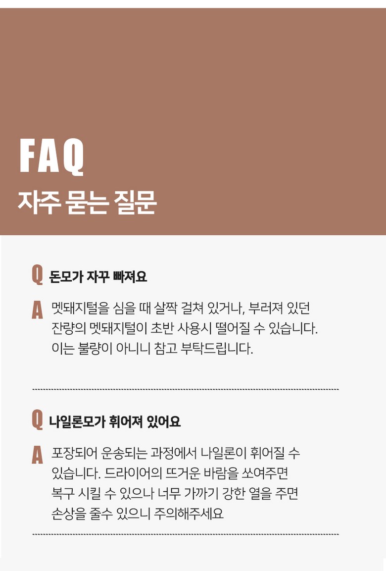 - ㆍ모니터 해상도의 차이로 인해 색상이나 이미지가 실제와 달라, 고객이 단순 변심으로 교환/반품을 무료로 요청하는 경우