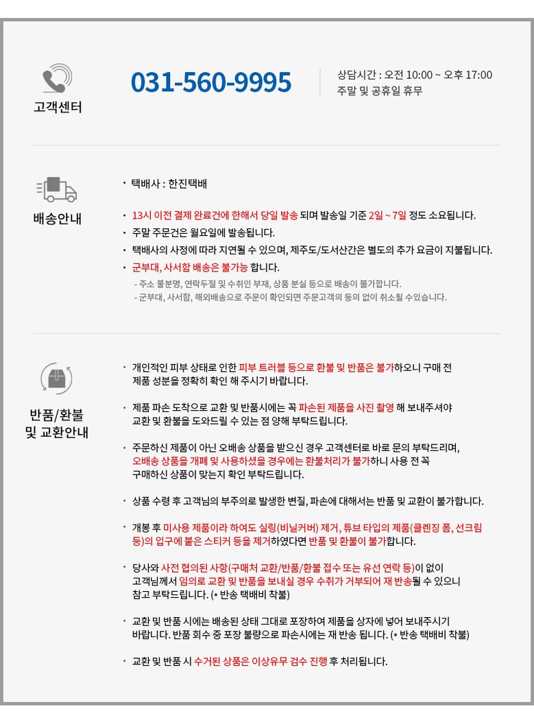 | 교환/반품 신청 기준일 | ㆍ단순변심에 의한 교환/반품은 제품 수령 후 7일 이내까지, 교환/반품 제한사항에 해당하지 않는 경우에만 가능 (배송비용과 교환/반품 비용 왕복배송비 고객부담) ㆍ상품의 내용이 표시·광고의 내용과 다른 경우에는 상품을 수령한 날부터 3개월 이내, 그 사실을 안 날 또는 알 수 있었던 날부터 |