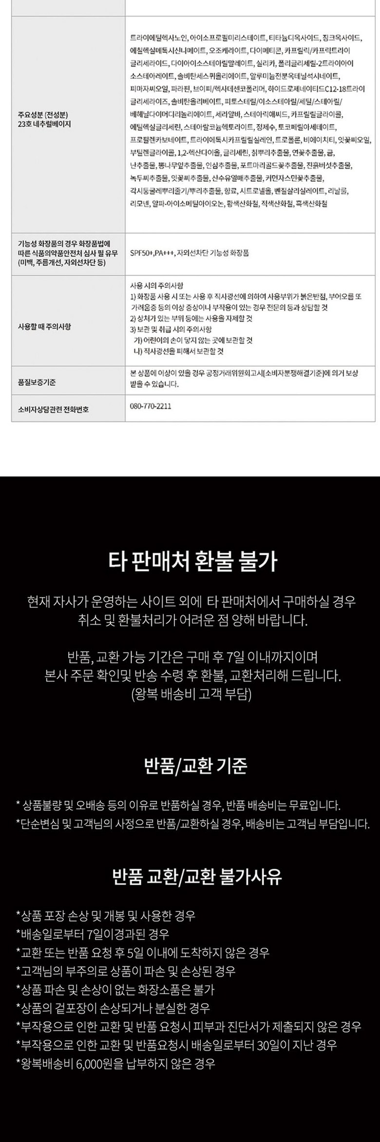 | 계절상품/식품/화장품 | ㆍ신선/냉장/냉동 상품의 단순변심의 경우 ㆍ뷰티 상품 이용 시 트러블(알러지, 붉은 반점, 가려움, 따가움)이 발생하는 경우, |