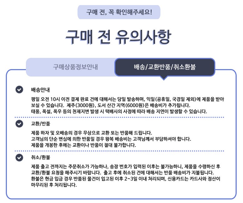 - ㆍ교환/반품에 관한 일반적인 사항은 판매자가 제시사항보다 관계법령이 우선합니다.