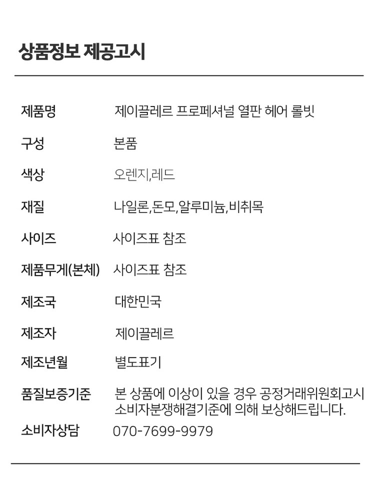 | 품명 및 모델명 | 제이끌레르 열판 돈모 헤어 프로페셔널 롤빗 | 인증/허가 사항 | 상품 상세페이지 참조 |