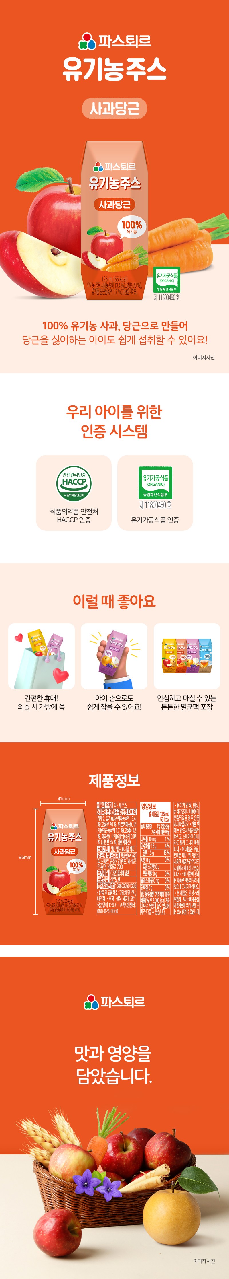 | 제품명 | 파스퇴르 유기농주스 사과당근 | 식품의 유형 | 컨텐츠 참조 |