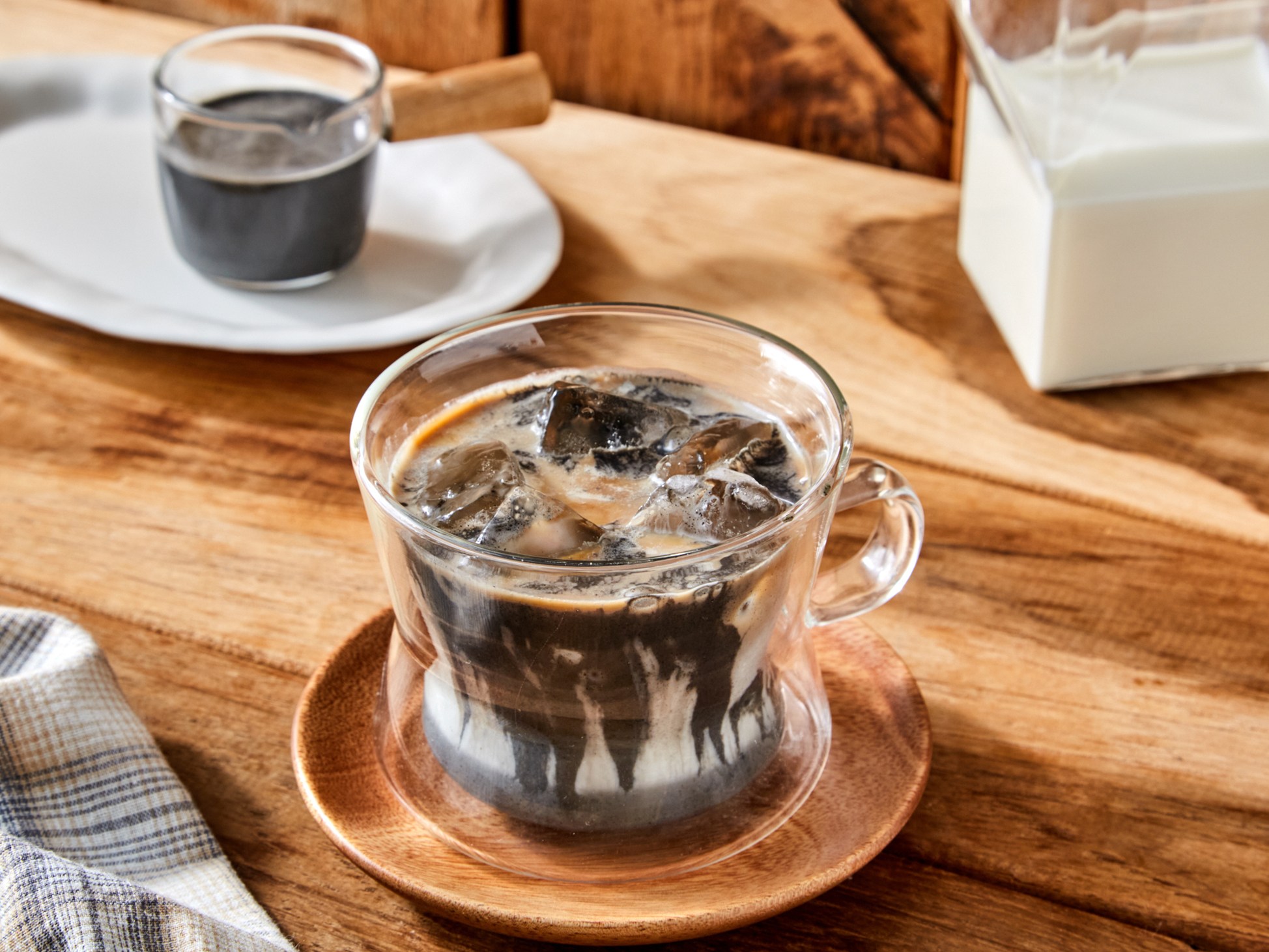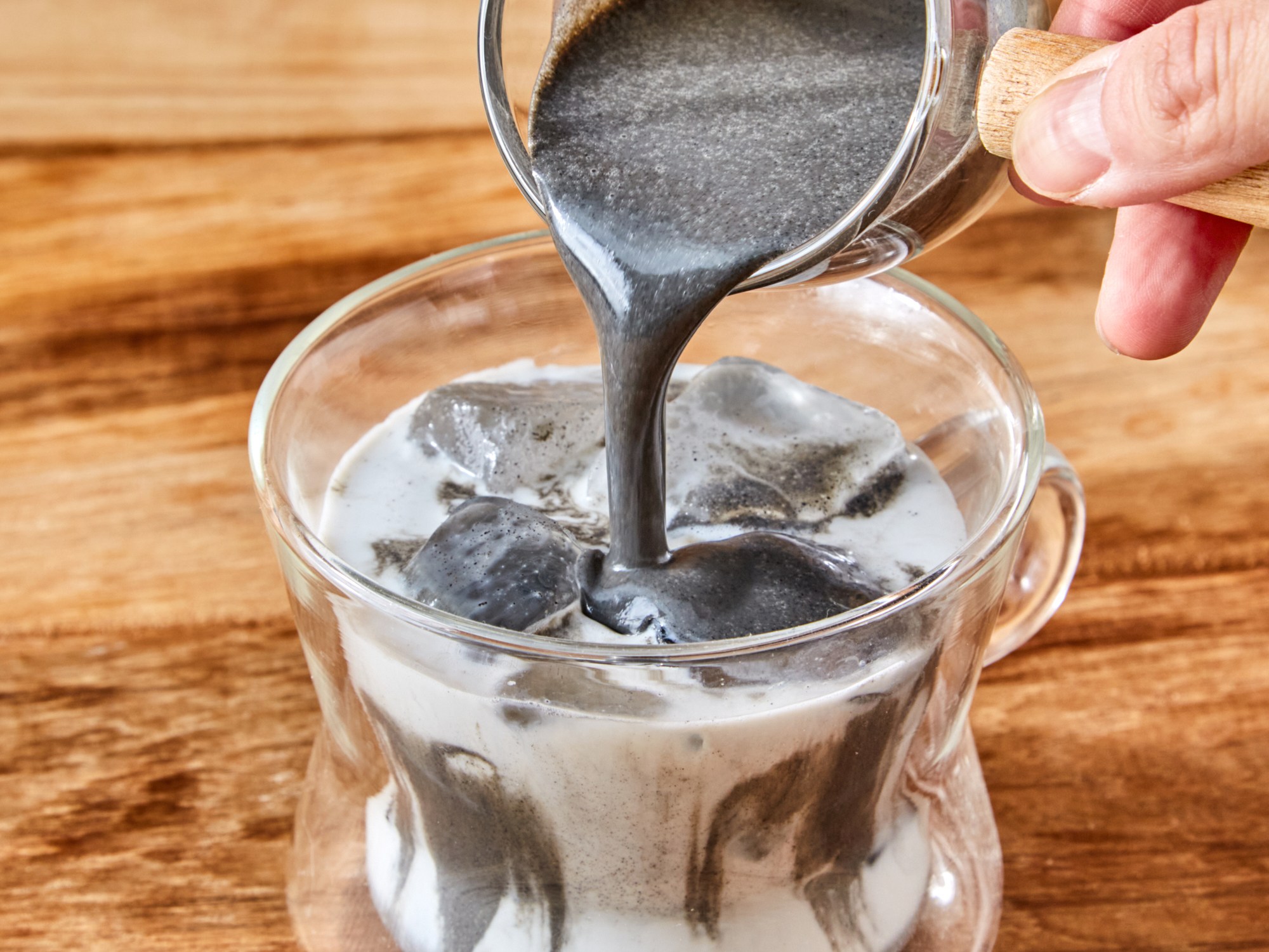 3. 우유와 흑임자 원액 베이스를 2:1의 비율로 섞어 넣어주세요.