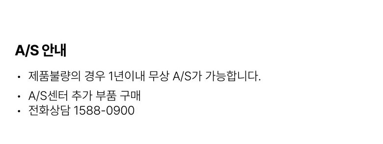 | 교환/반품 신청 기준일 | ㆍ단순변심에 의한 교환/반품은 제품 수령 후 7일 이내까지, 교환/반품 제한사항에 해당하지 않는 경우에만 가능 (배송비용과 교환/반품 비용 왕복배송비 고객부담) ㆍ상품의 내용이 표시·광고의 내용과 다른 경우에는 상품을 수령한 날부터 3개월 이내, 그 사실을 안 날 또는 알 수 있었던 날부터 |
