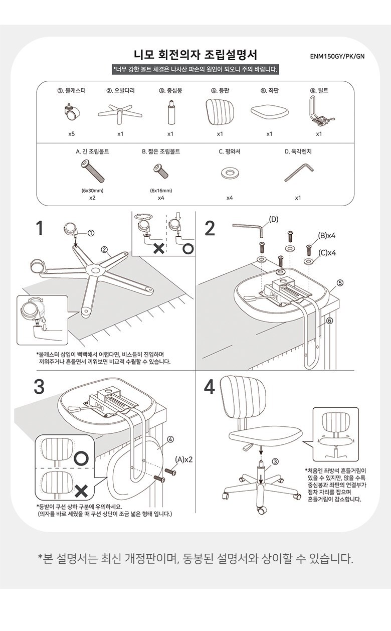| 품명 | 니모 회전의자 | KC 인증정보 | 「전기용품 및 생활용품 안전관리법」에 따른 공급자적합성확인대상제품에 한함 상품이 KC 대상인 경우, 본품 및 구성품 모두 인증번호 또는 인증번호가 없는 경우 KC 마크 여부를 기재해주세요. (대상이 아닌경우 "해당없음" 기재) |