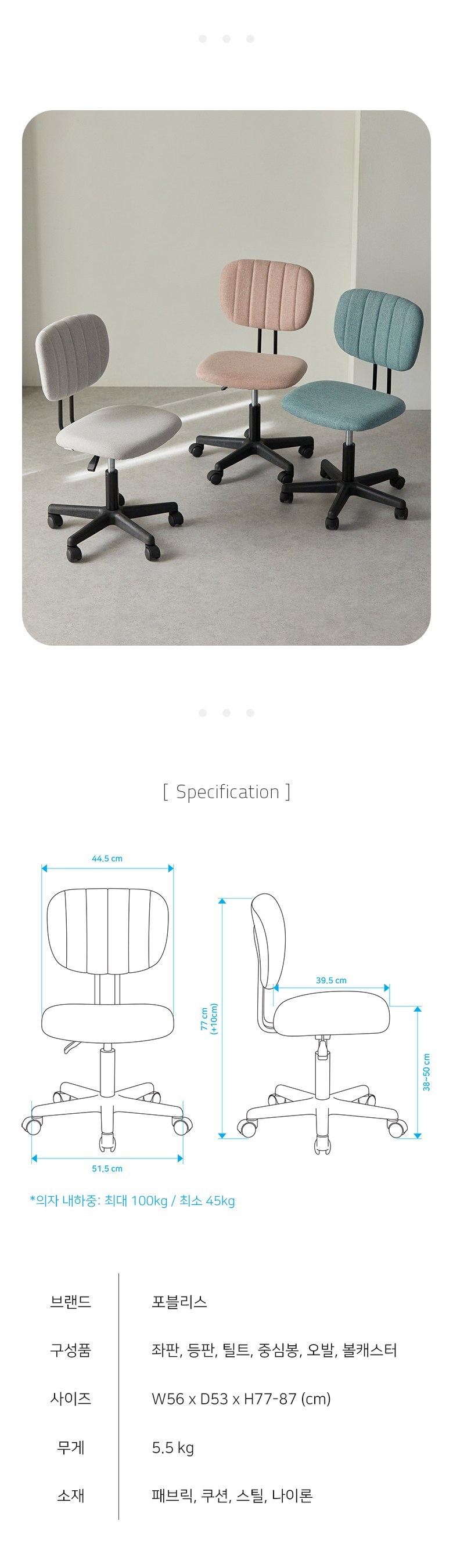 | 주요 소재 | 패브릭쿠션, 스틸프레임, 나일론캐스터, PP베이스 | 제조자(수입자) | 포블리스 OEM사(포블리스 에스엔디) |