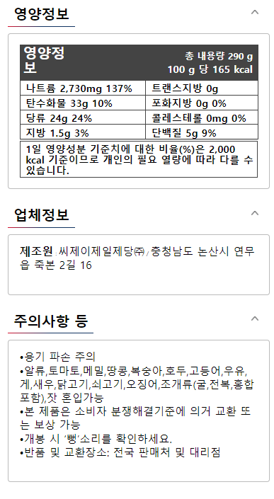 | 포장단위별 내용물의 용량(중량), 수량 | 290g x 3개 | 원재료명 및 함량 | 컨텐츠 참조 |