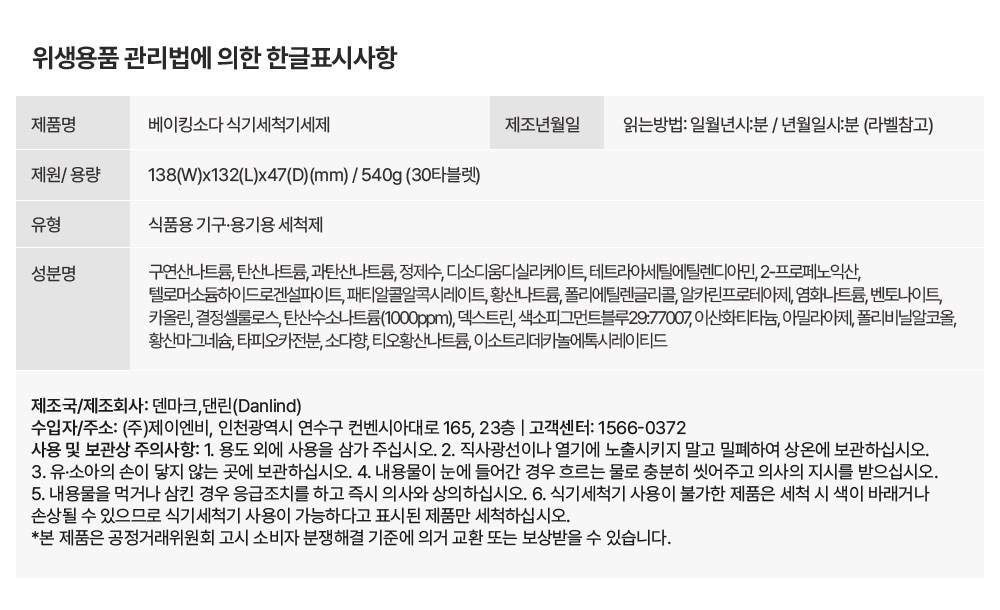 | 품명 및 모델명 | 베이킹소다 식기세척기 세제 | 인증/허가 사항 | 위생용품 |