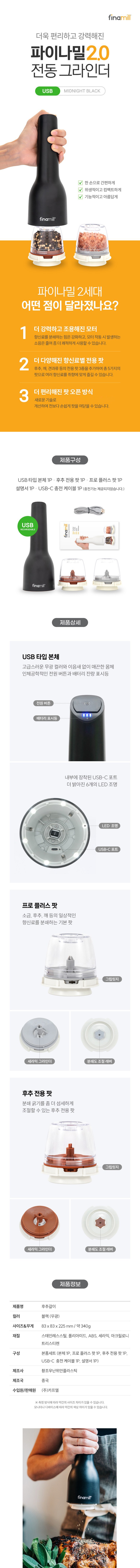 | 품명 및 모델명 | [FinaMill] 파이나밀 2세대 USB 전동그라인더 블랙 / GP813437-111MIB | 재질 | 컨텐츠 참조 |