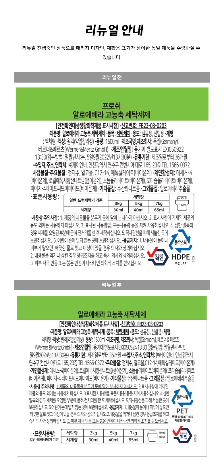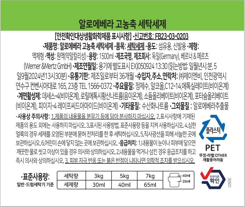 | 품목 및 제품명 | 세탁세제/ 알로에베라 고농축 세탁세제 | 용도(표백제의 경우 계열을 함께표시) 및 제형 | 섬유용,신발용/액체형 |