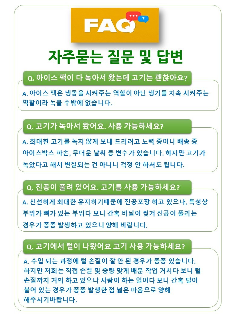 | 배송방법 | 신선/냉장/냉동 | 배송비 | 무료배송 · 도서산간 추가 배송비 - 제주 지역: 3,000원 - 도서산간 지역: 5,000원 |