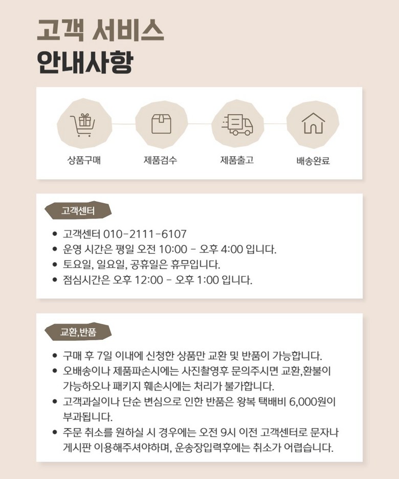 - ㆍ모니터 해상도의 차이로 인해 색상이나 이미지가 실제와 달라, 고객이 단순 변심으로 교환/반품을 무료로 요청하는 경우