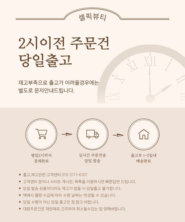 | 배송기간 | ㆍ도서산간 지역 등은 배송에 3-5일이 더 소요될 수 있습니다. - 천재지변, 물량 수급 변동 등 예외적인 사유 발생 시, 다소 지연될 수 있는 점 양해 부탁드립니다. | ||
