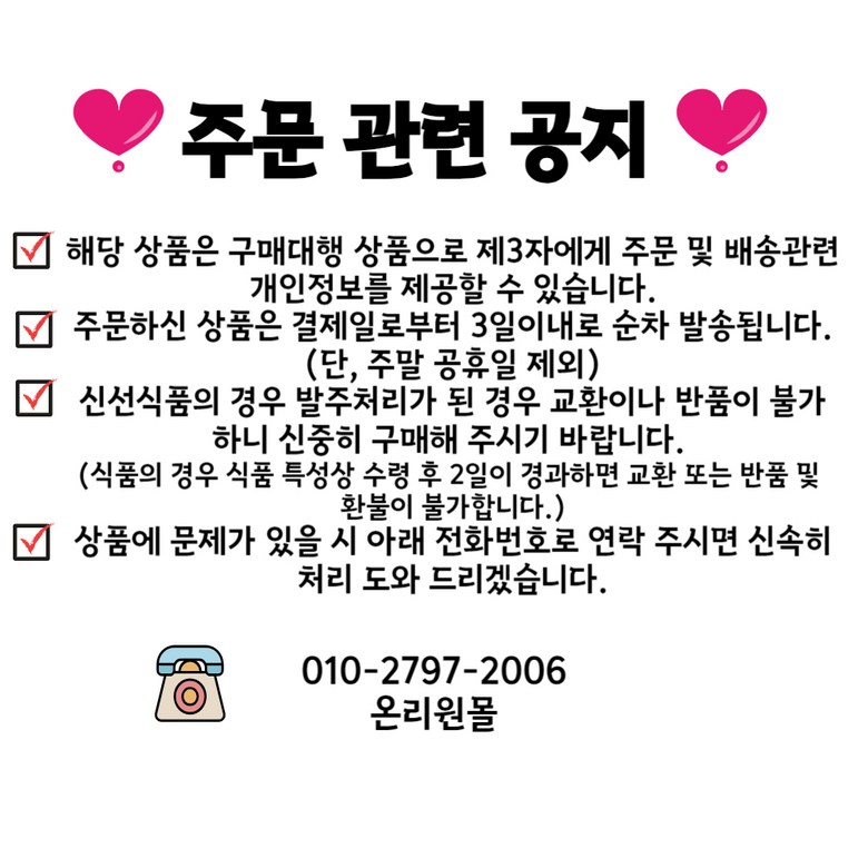 - 상품문의 및 후기게시판을 통해 취소나 환불, 반품 등은 처리되지 않습니다.