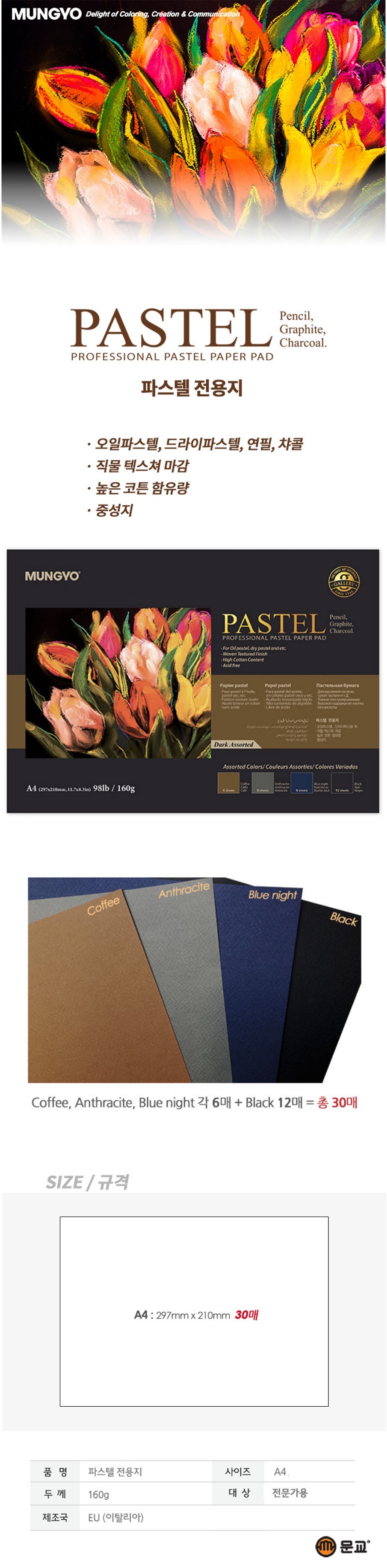 | 품명 및 모델명 | 문교 파스텔 전용지 A4, 160g, 다크색 4종, 30매, 1권 A4 1권 30매 | 인증/허가 사항 | 해당없음(전문가용) |