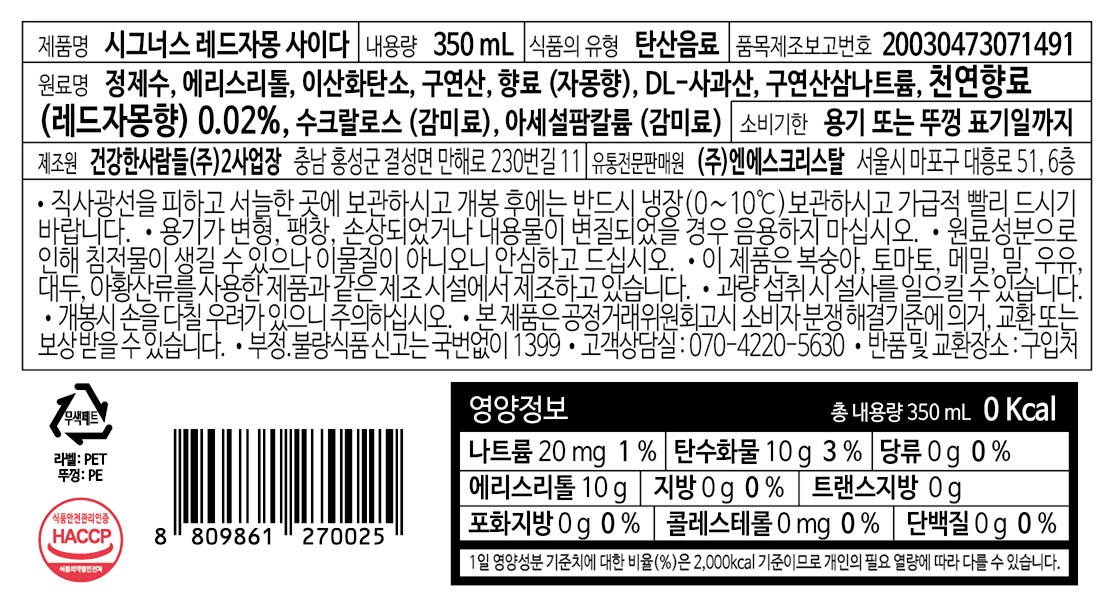 | 포장단위별 내용물의 용량(중량), 수량 | 350ml*24개 | 원재료명 및 함량 | 컨텐츠 참조 |