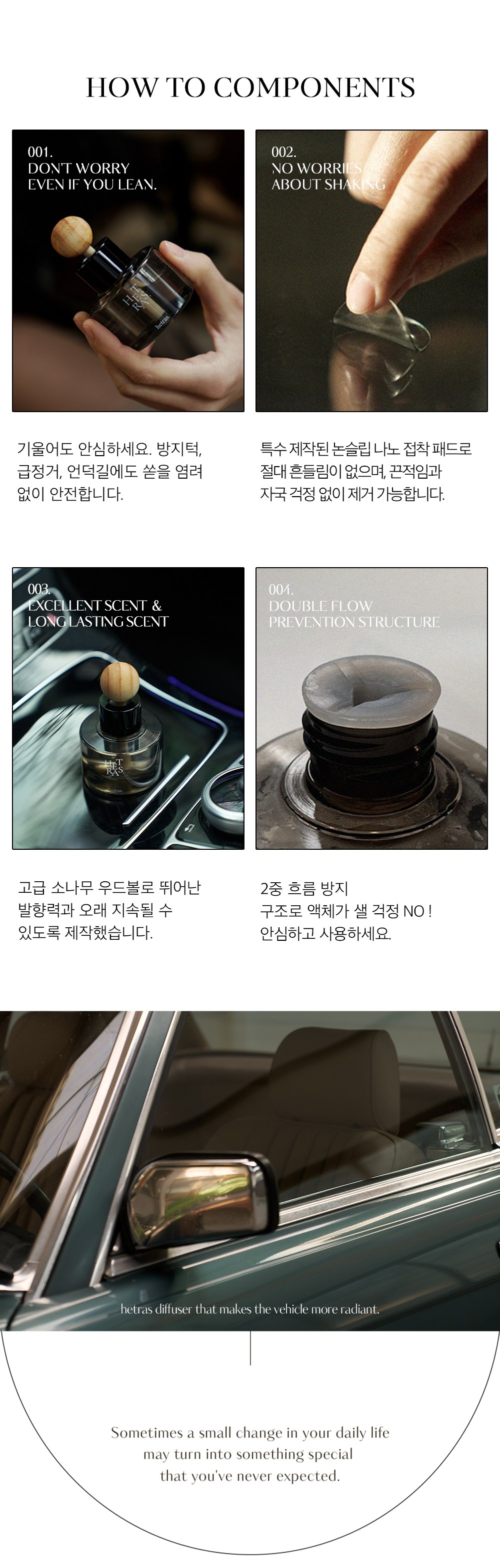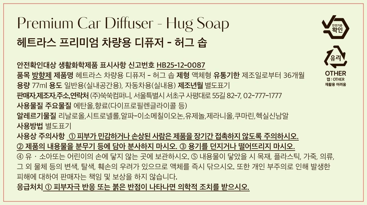 | 품목 및 제품명 | 방향제 / 헤트라스 차량용 디퓨저 - 허그솝 | 용도(표백제의 경우 계열을 함께표시) 및 제형 | 자동차용-실내용, 일반용-실내공간용 / 액체형 |