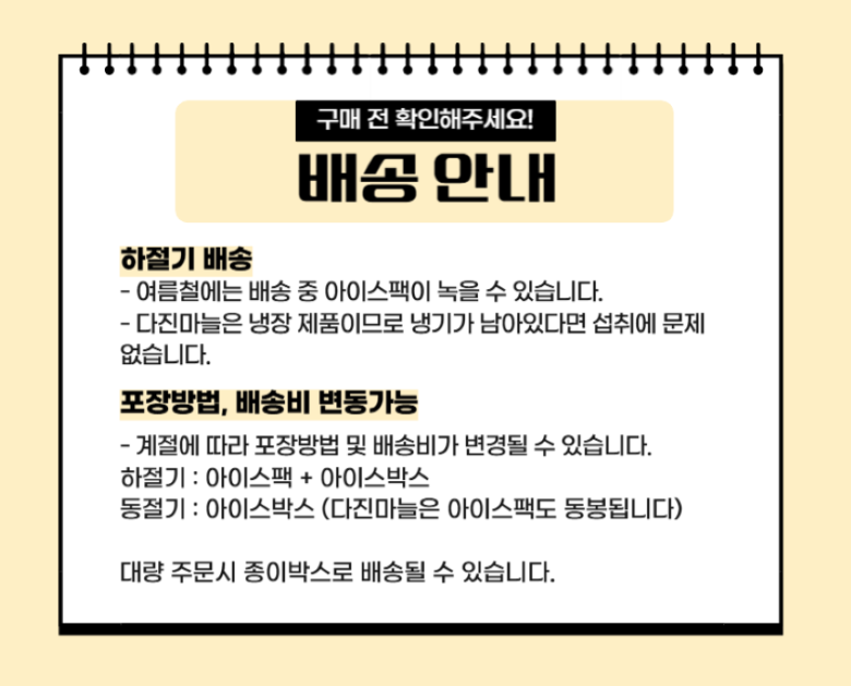 | 배송기간 | ㆍ도서산간 지역 등은 배송에 3-5일이 더 소요될 수 있습니다. - 천재지변, 물량 수급 변동 등 예외적인 사유 발생 시, 다소 지연될 수 있는 점 양해 부탁드립니다. | ||