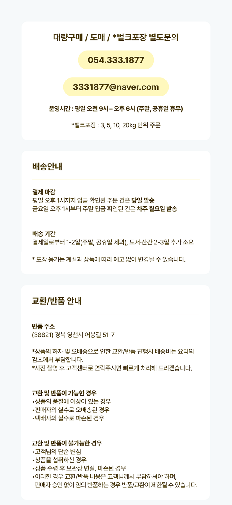 - ㆍ교환/반품에 관한 일반적인 사항은 판매자가 제시사항보다 관계법령이 우선합니다.