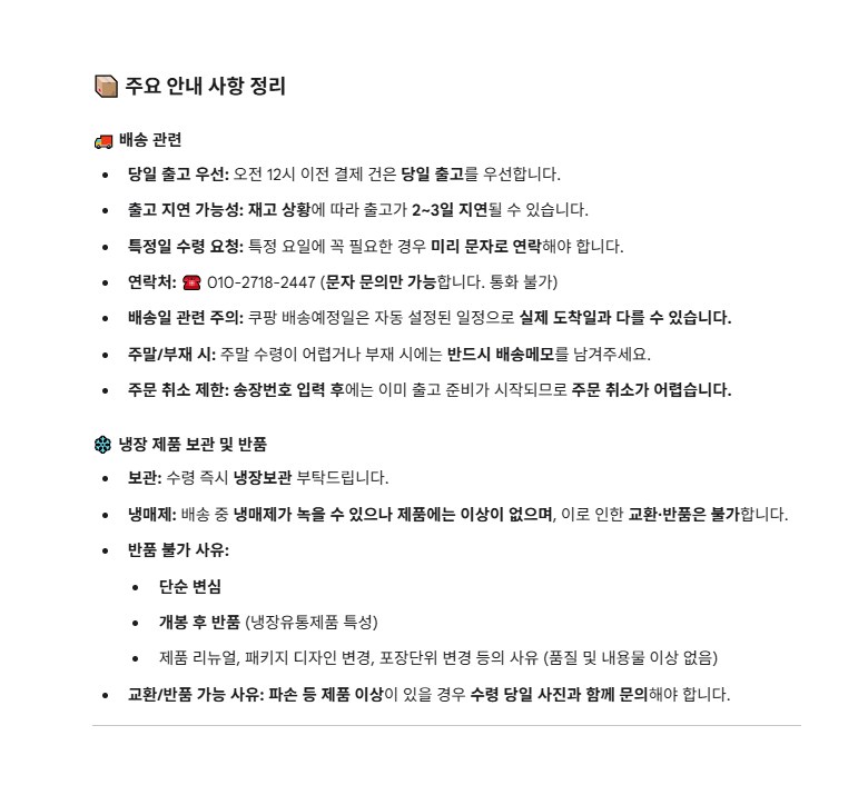 | 배송방법 | 신선/냉장/냉동 | 배송비 | 8,000원 - 도서산간 지역 배송불가 |