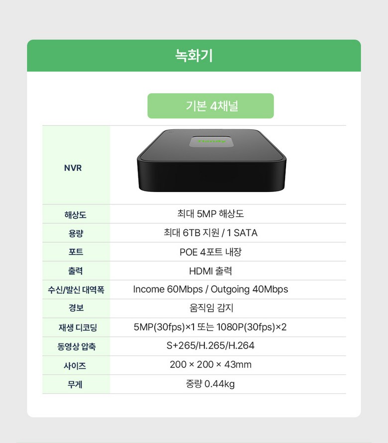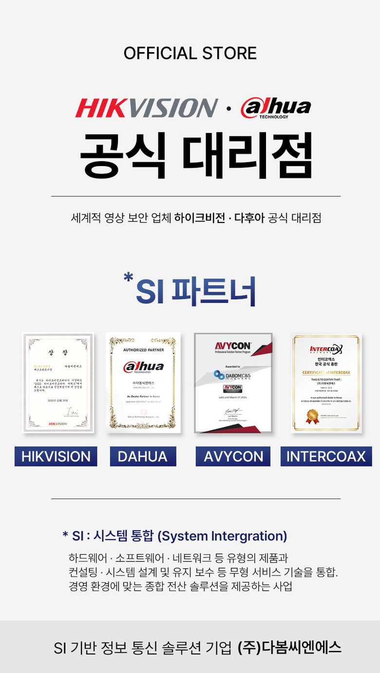 | 제조국 | 중국 | 크기 | 카메라 치수-실내용 : 117 x 117 x 96 mm-실외용 : 164 x 73 x 73 mm녹화기 치수200 X 200 X 43mm |