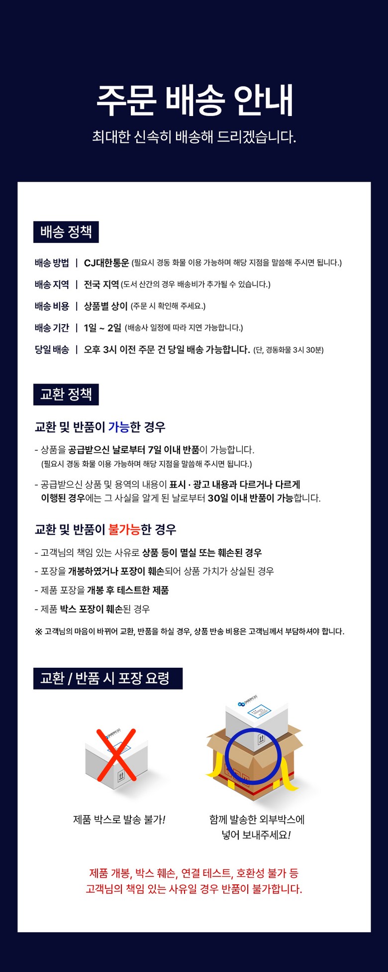 - ㆍ교환/반품에 관한 일반적인 사항은 판매자가 제시사항보다 관계법령이 우선합니다.