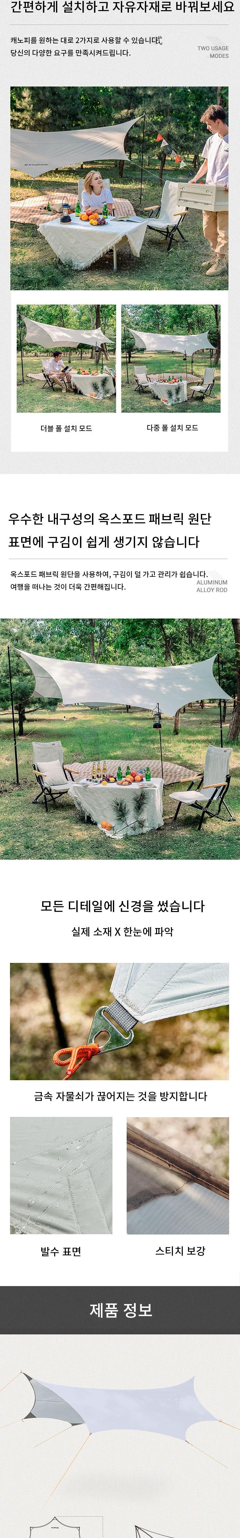 이중 폴 구조, 다중 폴 구조 등으로 다양하게 사용할 수 있습니다. 원단의 뒷면은 실버 코팅되어, 햇빛을 차단해줍니다. 모서리 봉제 부분을 보강하여, 내구성이 뛰어납니다. 5개의 로프에는 반사되는 부분이 있으며, 텐트못에도 헤드 부분이 야광 처리되어, 밤에도 쉽게 볼 수 있습니다.