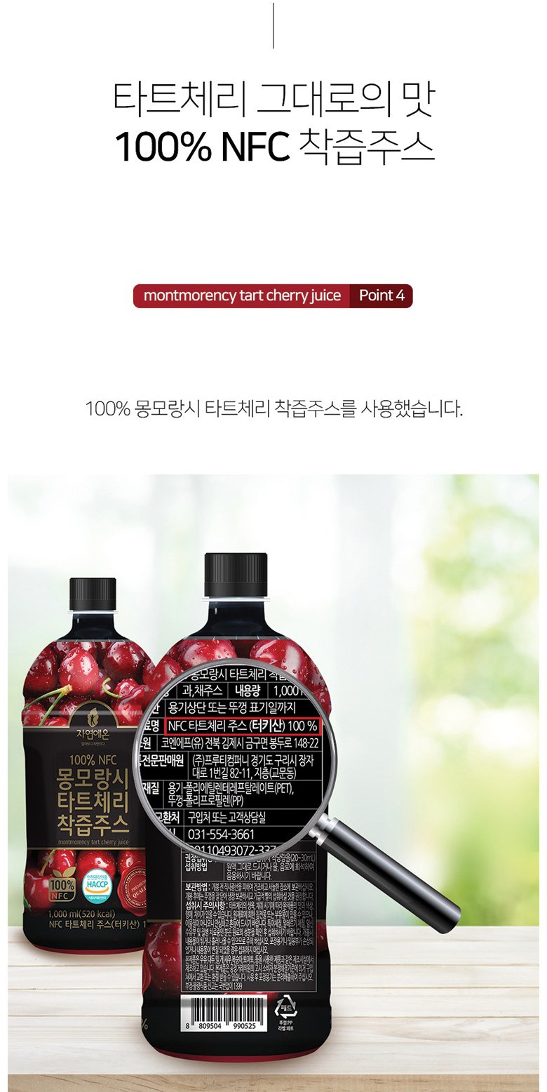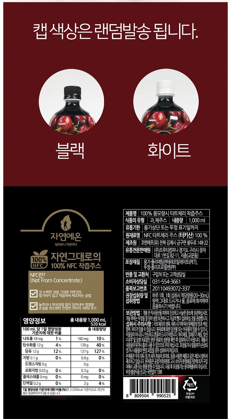 | 제품명 | 100% 몽모랑시 타트체리 착즙주스 | 식품의 유형 | 과채주스 |