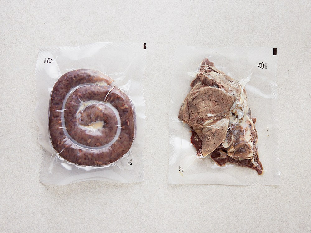 2. 찰순대와 내장모둠의 포장지를 살짝 개봉해주세요.