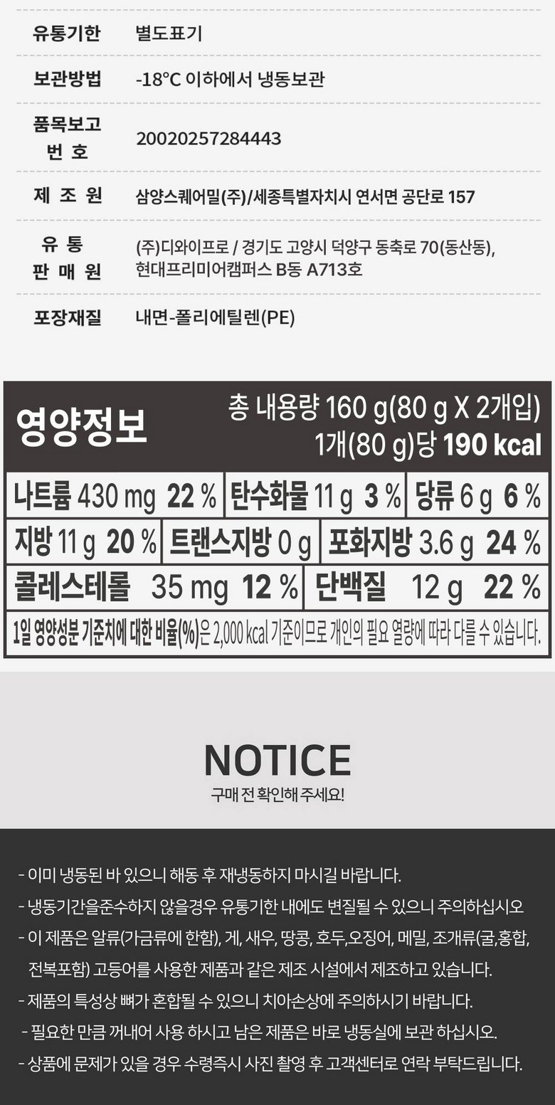 | 생산자 및 소재지 | (주)삼양스퀘어밀 / 세종특별자치시 연서면 공단로 157 | 제조연월일, 소비기한 또는 품질유지기한 | 제품별도표기 |