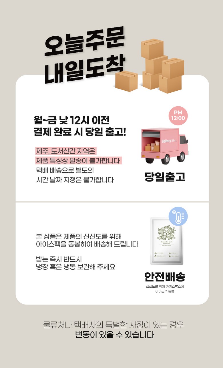 | 배송방법 | 신선/냉장/냉동 | 배송비 | 무료배송 - 도서산간 지역 배송불가 |