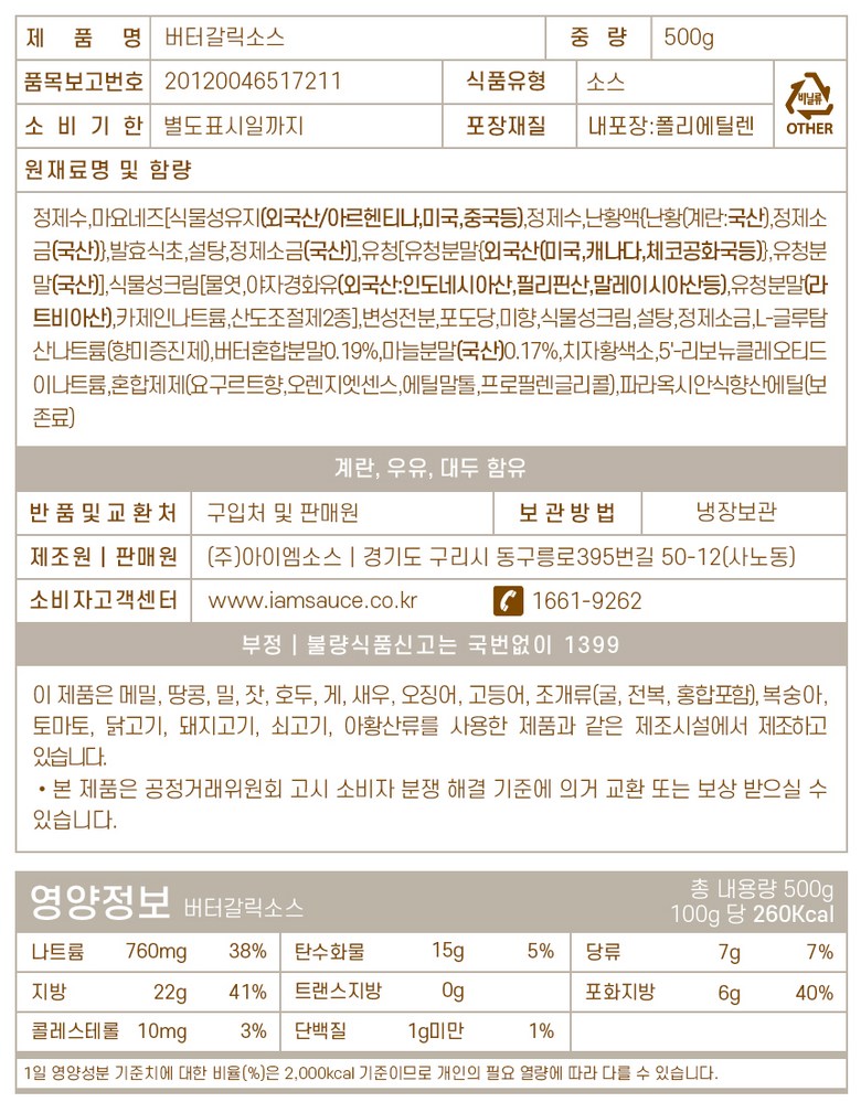 | 제품명 | 버터갈릭소스 | 식품의 유형 | 소스 |