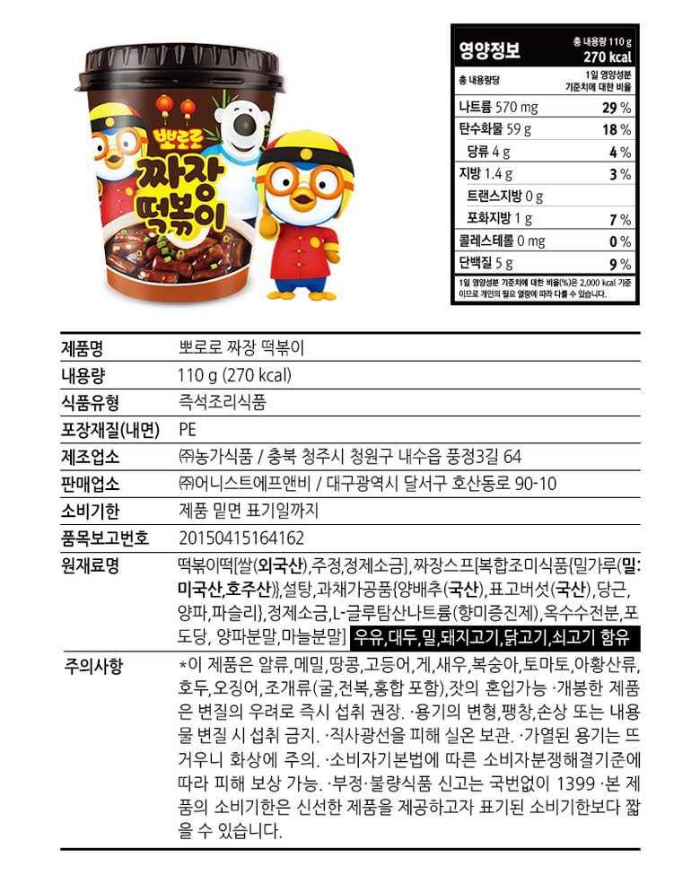 | 제품명 | 뽀로로 짜장 떡볶이 | 식품의 유형 | 즉석조리식품 |