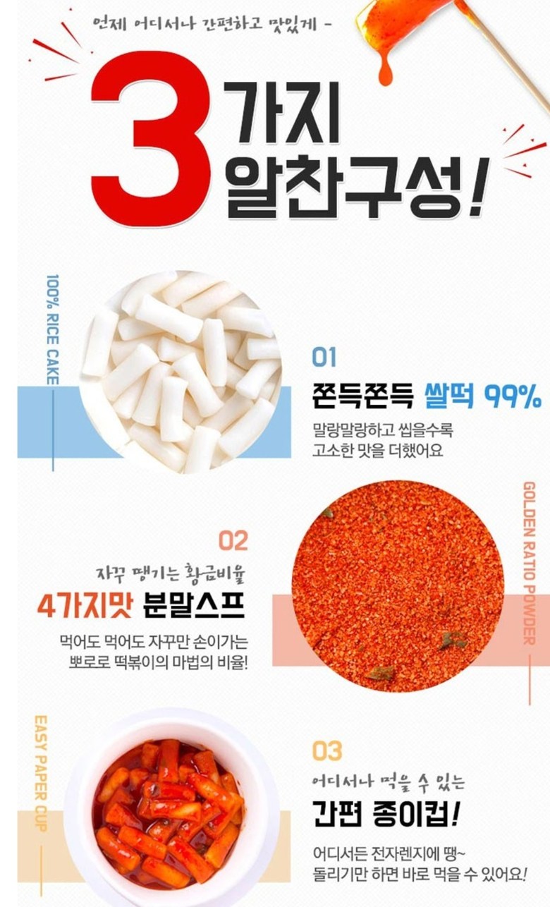 | 포장단위별 내용물의 용량(중량), 수량 | 110g 10개입 | 원재료명 및 함량 | 떡복이떡90.91%(쌀99%,외국산), 떡복이짜장분말스프9.09%(외국산) 외 |