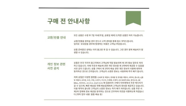 - ㆍ교환/반품에 관한 일반적인 사항은 판매자가 제시사항보다 관계법령이 우선합니다.