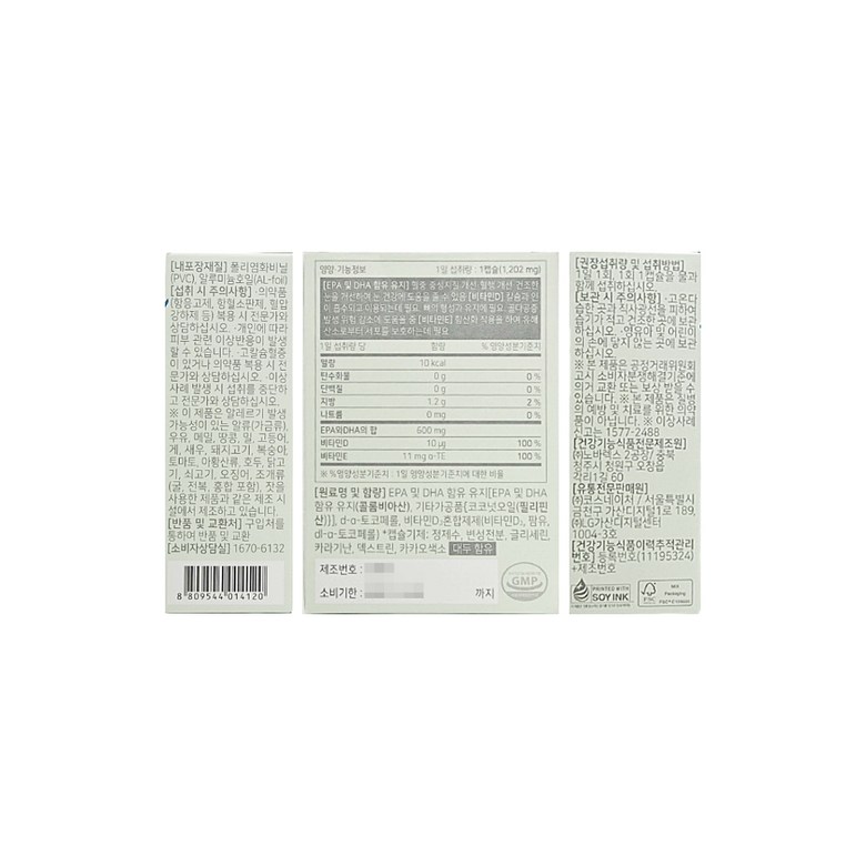| 원료명 및 함량 | EPA 및 DHA 함유 유지[EPA 및 DHA 함유 유지(콜롬비아산), 기타가공품{코코넛오일(필리핀산)}] d-α-토코페롤, 비타민D3혼합제제(비타민D3, 팜유, dl-α-토코페롤), *캡슐기제 : 정제수, 변성전분, 글리세린, 카라기난, 덱스트린, 카카오색소 / 대두 함유 | 영양정보 | 1일 섭취량 : 1캡슐(1,202mg) 열량 10kcal, 탄수화물 0g(0%), 단백질 0g(0%), 지방 1.2g(2%), 나트륨 0mg(0%), EPA와 DHA의 합 600mg, 비타민D 10㎍(100%), 비타민E 11mg α-TE(100%) *( )안의 수치는 1일 영양성분기준치에 대한 비율임 |