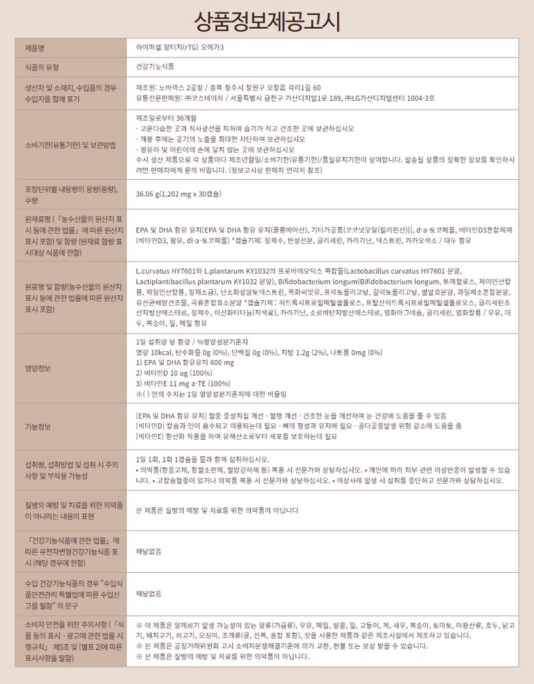| 제품명 | 하이퍼셀 알티지(rTG) 오메가3 | 제조업소의 명칭과 소재지 | 제조원 : (주)노바렉스 2공장 / 충청북도 청주시 청원구 오창읍 각리1길 60 판매원 : (주)코스네이처 / 서울특별시 금천구 가산디지털1로 189, (주)LG가산디지털센터 1004-3호 |