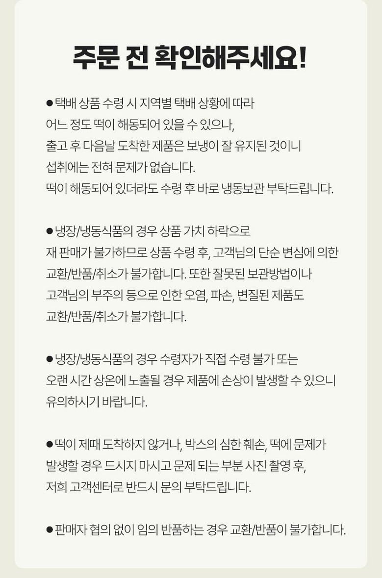 | 계절상품/식품/화장품 | ㆍ신선/냉장/냉동 상품의 단순변심의 경우 ㆍ뷰티 상품 이용 시 트러블(알러지, 붉은 반점, 가려움, 따가움)이 발생하는 경우, |