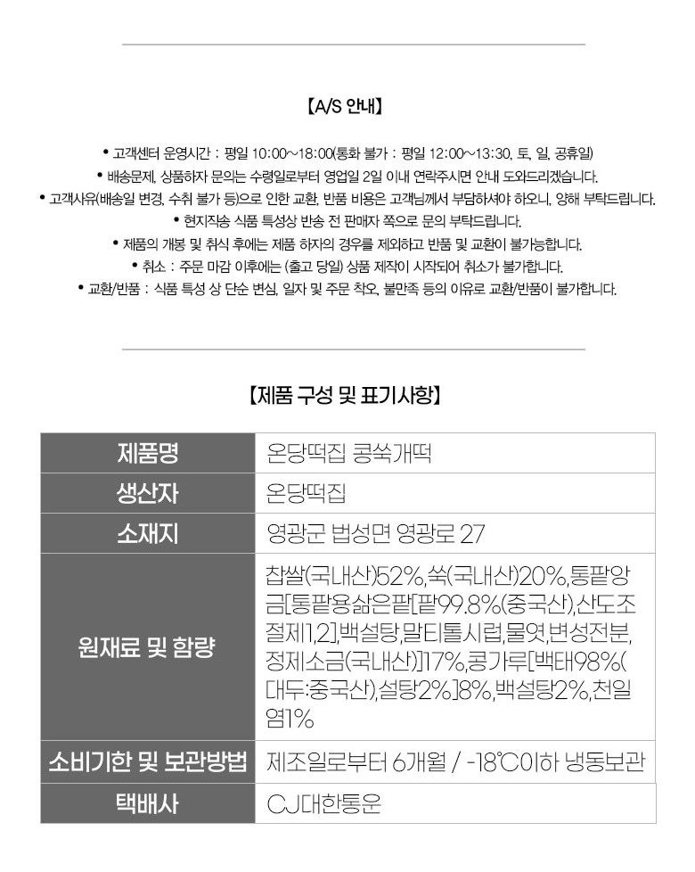 | 생산자 및 소재지 | 상품 상세페이지 참조 | 제조연월일, 소비기한 또는 품질유지기한 | 상품 상세페이지 참조 |