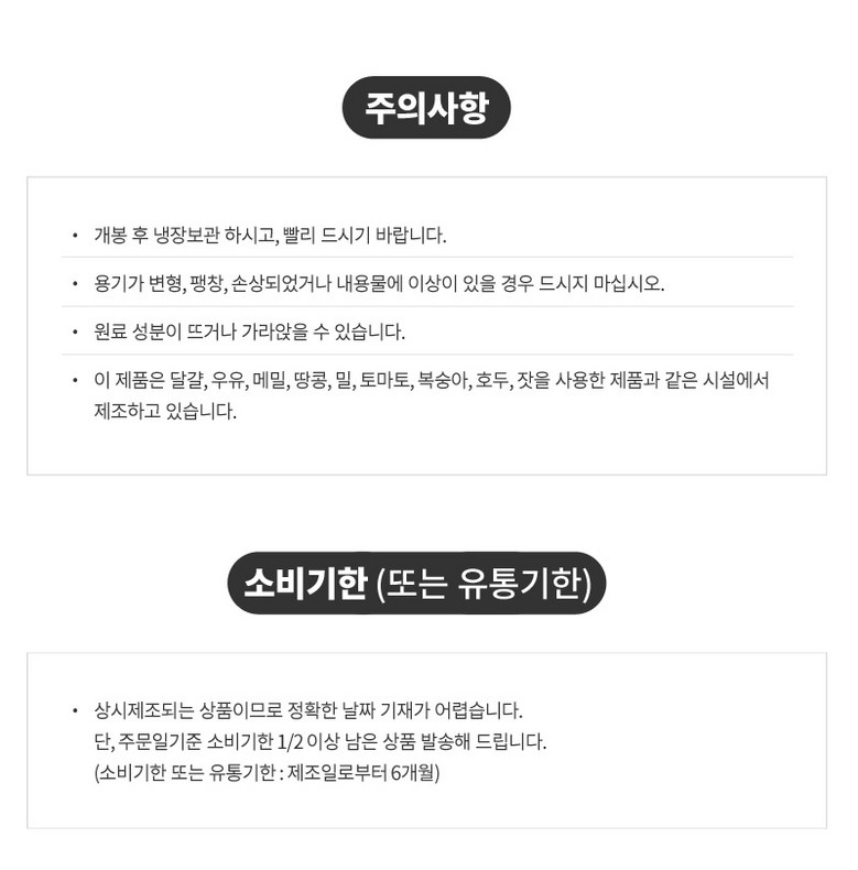 | 생산자 및 소재지 | 상품 상세페이지 참조 | 제조연월일, 소비기한 또는 품질유지기한 | 상품 상세페이지 참조 |