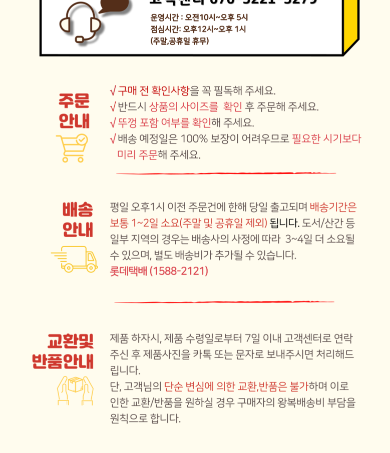 - ㆍ모니터 해상도의 차이로 인해 색상이나 이미지가 실제와 달라, 고객이 단순 변심으로 교환/반품을 무료로 요청하는 경우