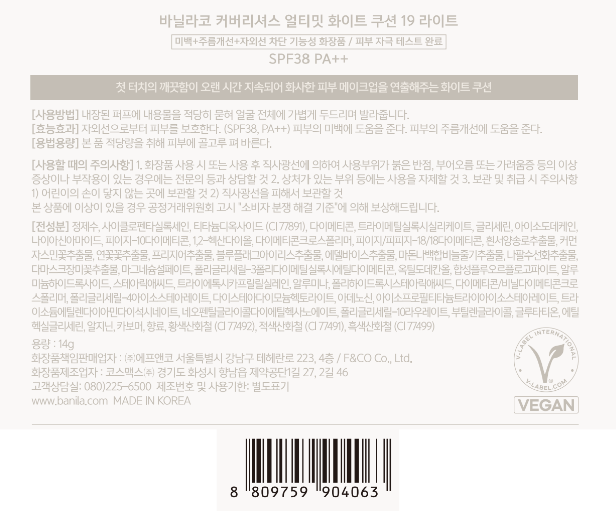 | 화장품제조업자, 화장품책임판매업자 및 맞춤형화장품판매업자 | 코스맥스(주) / (주)에프앤코 | 제조국 | 대한민국 |