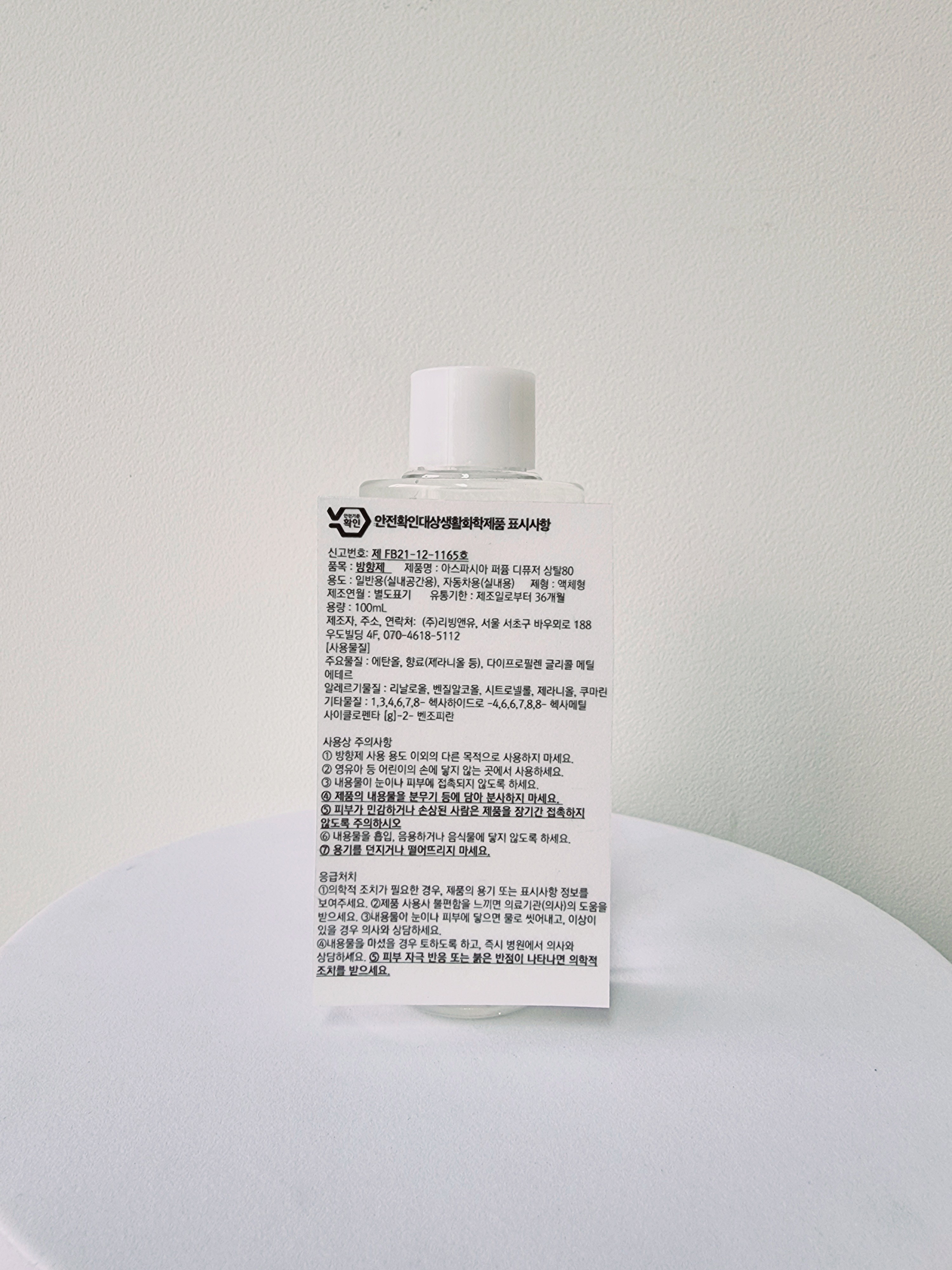 | 품목 및 제품명 | 방향제 / 아스파시아 퍼퓸 디퓨저 상탈80 | 용도(표백제의 경우 계열을 함께표시) 및 제형 | 자동차용-실내용,일반용-실내공간용 / 비분사형-액체형 |