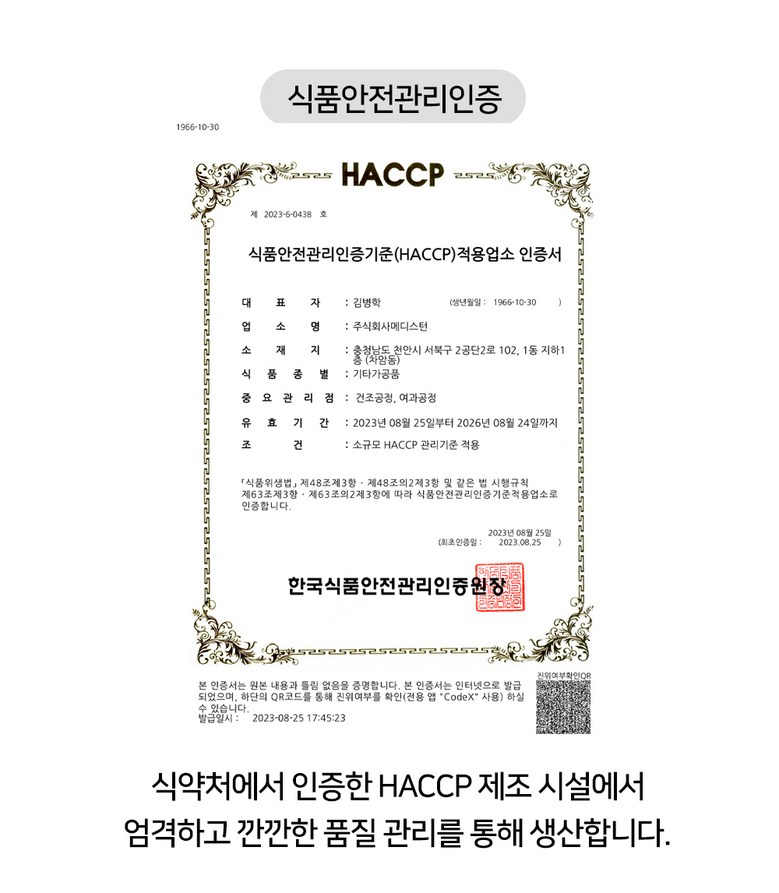 | 식품의 유형 | 기타가공품(살균제품) | 생산자/소재지(수입품의 경우 생산자, 수입자 및 제조국) | (주)메디스턴/충청남도 천안시 서북구 2공단 2로 102 |
