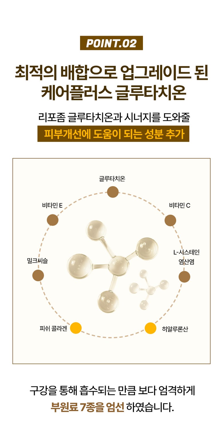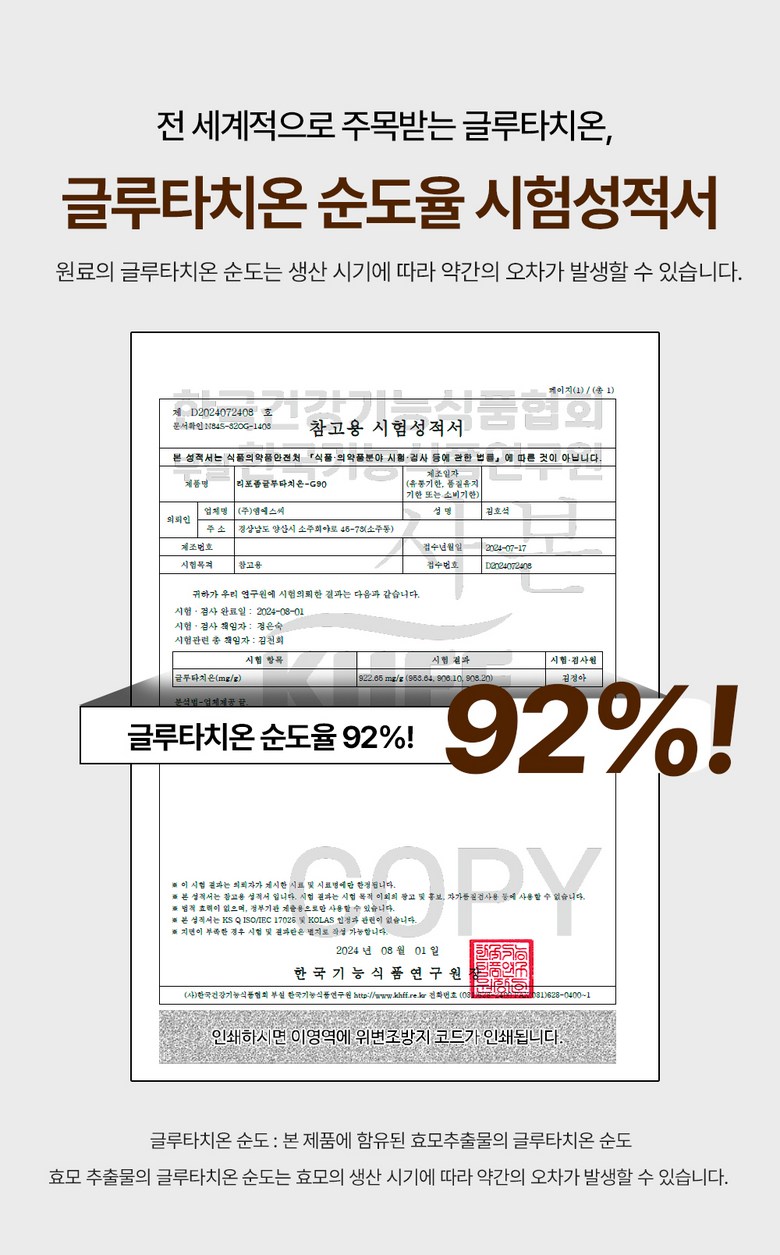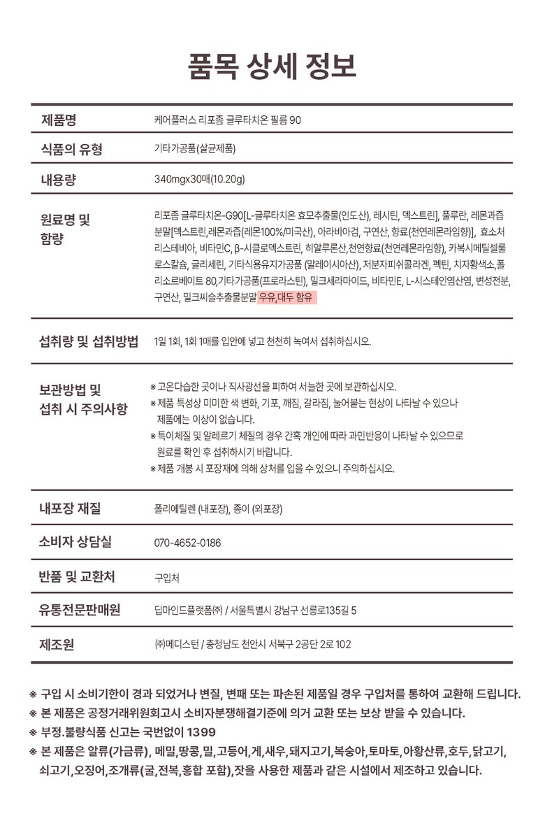 | 원재료명 및 함량 | L-글루타치온 효모추출물L-글루타치온 50%, 네덜란드산) 30.77%, 풀루란, 비타민C, 레몬과즙분말[덱스트린, 레몬과즙(레몬 100%; 미국산), 아라비아검, 구연산, 혼합제제(주정, 정제수, 천연향료)], 히드록시프로필메틸셀룰로스, 효소처리스테비아, 밀크씨슬추출물분말(미국산), β-시클로덱스트린, 글리세린, 천연향료(천연레몬향), 무수구연산, 기타식용유지가공품, 비타민E50%혼합제제(dl-α-토코페릴아세테이트, 변성전분, 포도당시럽분말, 이산화규소), 치자황색소, L-시스테인염산염, 변성전분 /우유 함유 ※ 본 제품은 알류(가금류), 메밀, 땅콩, 대두, 밀, 고등어, 게, 새우, 돼지고기, 복숭아, 토마토, 아황산류, 호두, 닭고기, 쇠고기, 오징어, 조개류(굴, 전복, 홍합 포함), 잣을 사용한 제품과 같은 시설에서 제조하고 있습니다. | 영양성분 | 해당사항 없음 |