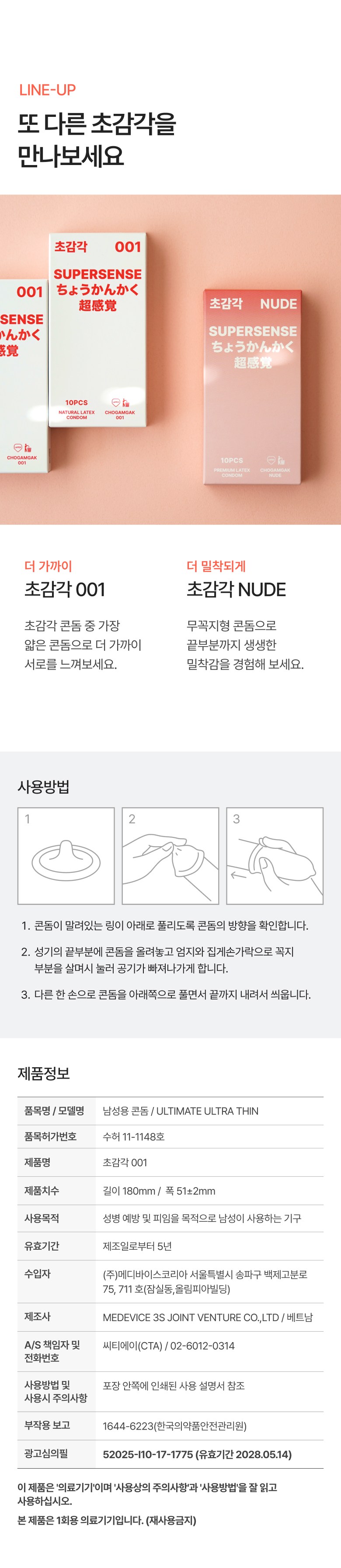 | 품명 및 모델명 | 남성용 콘돔 / ULTIMATE ULTRA THIN | 허가∙인증∙신고번호 (의료기기법에 따른 허가∙인증∙신고 대상 의료기기에 한함) | 수허 11-1148호 |